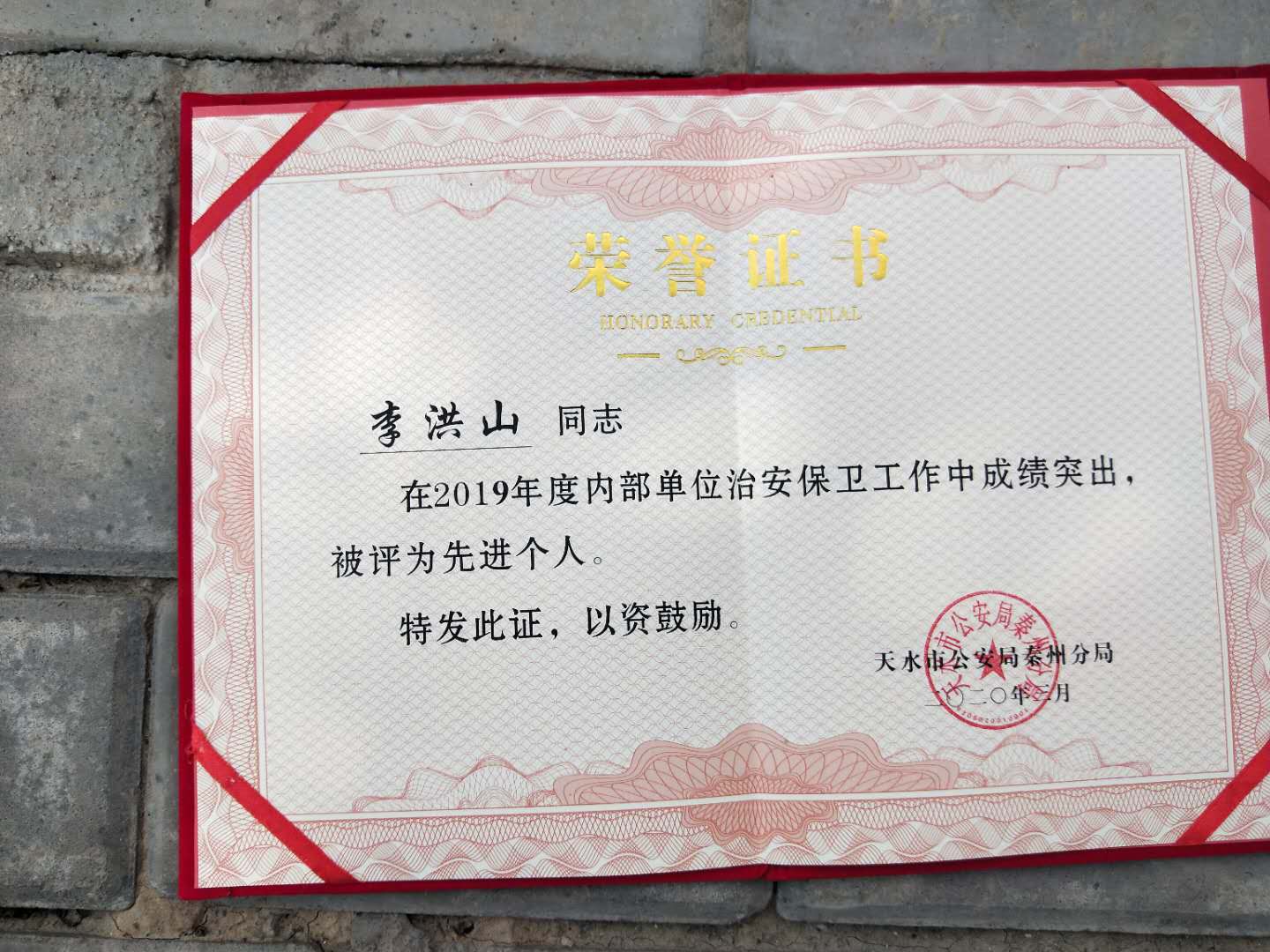 4月10日,天水市公安局秦州分局舉行表彰2019年度內(nèi)部單位治安保衛(wèi)工作先進(jìn)集體及先進(jìn)個(gè)人頒獎(jiǎng)典禮。天水合金武保室主管李洪山同志被授予天水市公安局秦州區(qū)分局內(nèi)部單位治安保衛(wèi)工作“先進(jìn)個(gè)人”榮譽(yù)稱號(hào)。